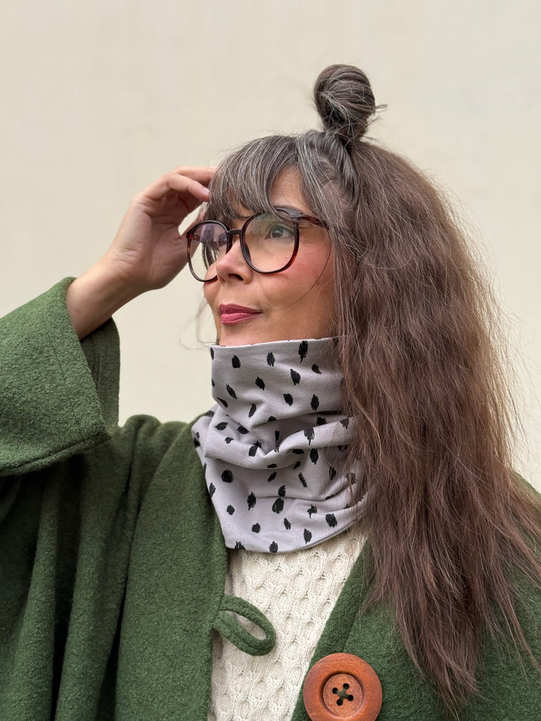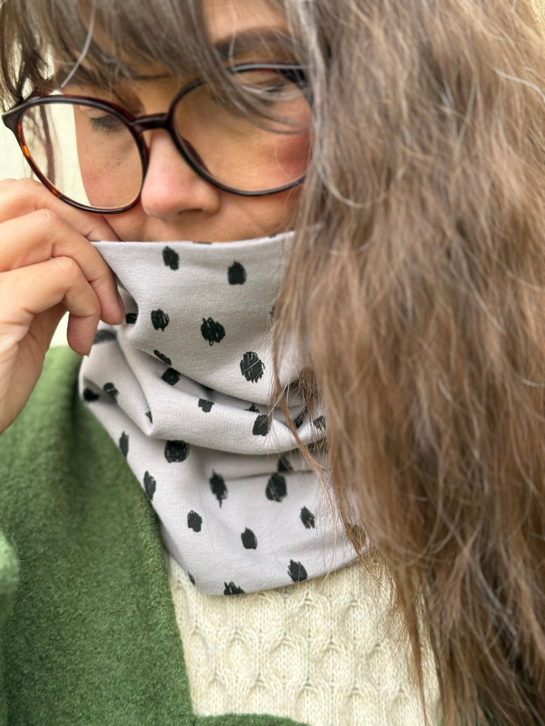 Dessa tubsjalar är helt och hållet sytt av tyg som annars skulle gått till spillo. Just denna är grå med svarta fläckar.