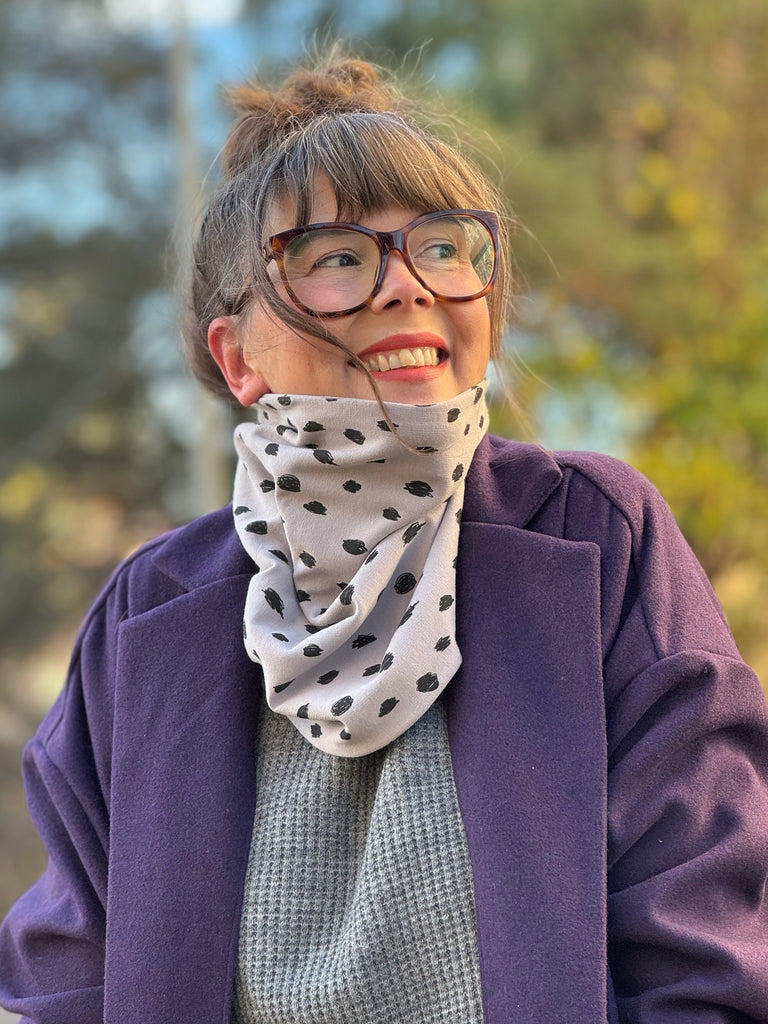 En tubsjal i mjukt collagetyg som stoppar snålblåsten. Du drar den över huvudet och den sitter där den ska utan att rasa ner.