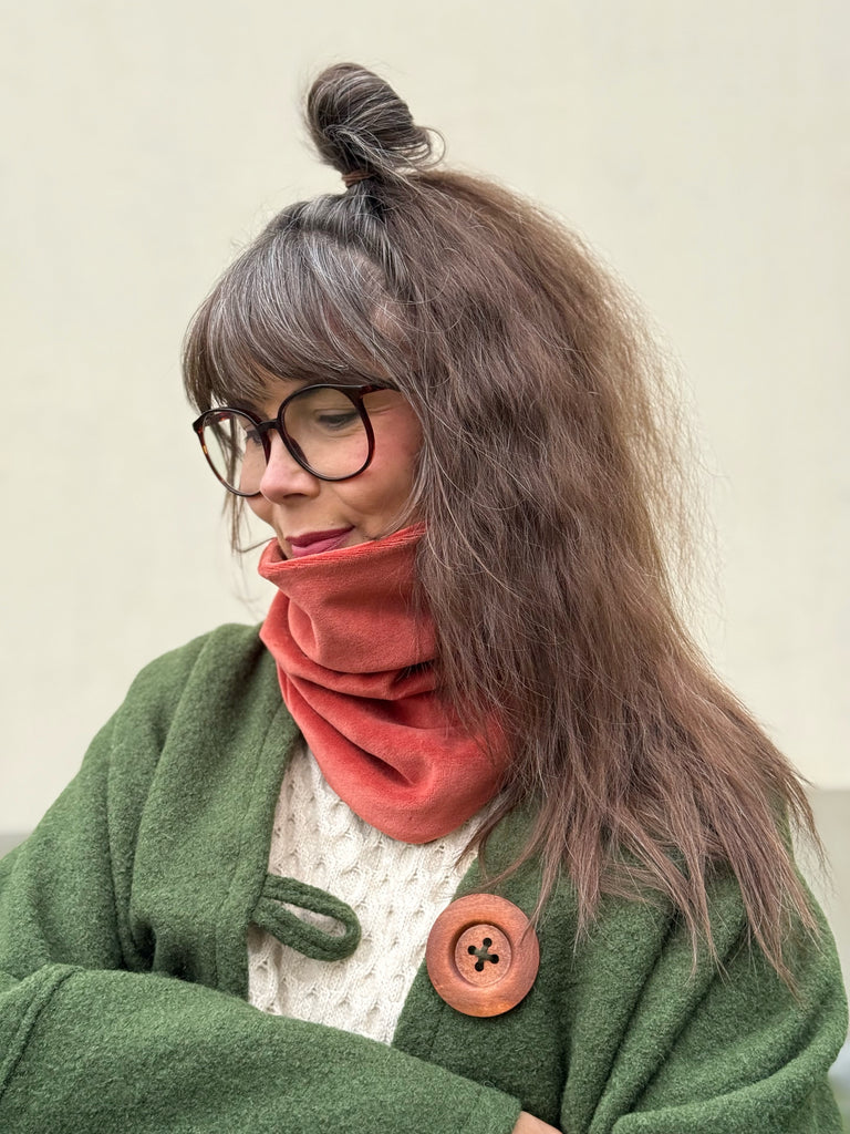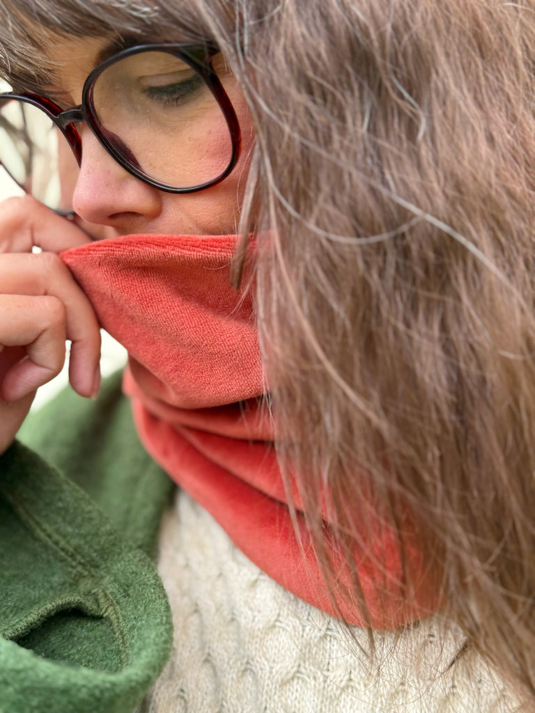 En tubsjal i velour som stoppar snålblåsten. Du drar den över huvudet och den sitter där den ska utan att rasa ner.