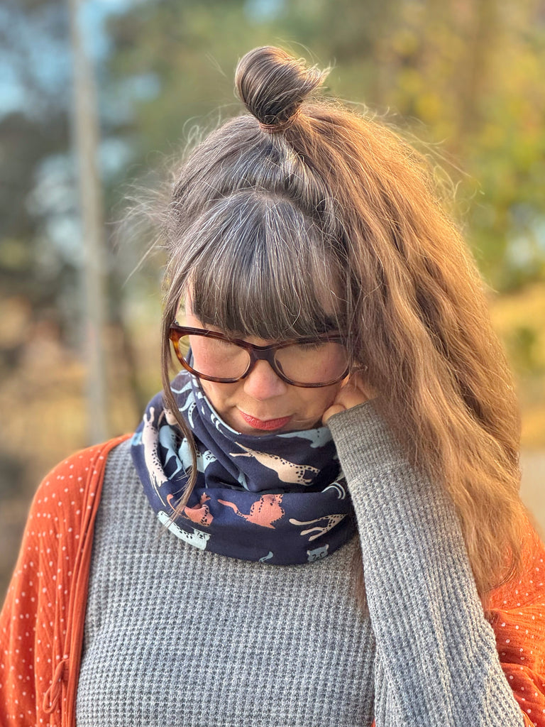 En tubsjal i mjukt collagetyg som stoppar snålblåsten. Du drar den över huvudet och den sitter där den ska utan att rasa ner.