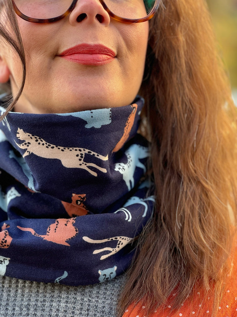 Dessa tubsjalar är helt och hållet sytt av tyg som annars skulle gått till spillo. Just denna är mörkblå med kattdjur i olika färger.
