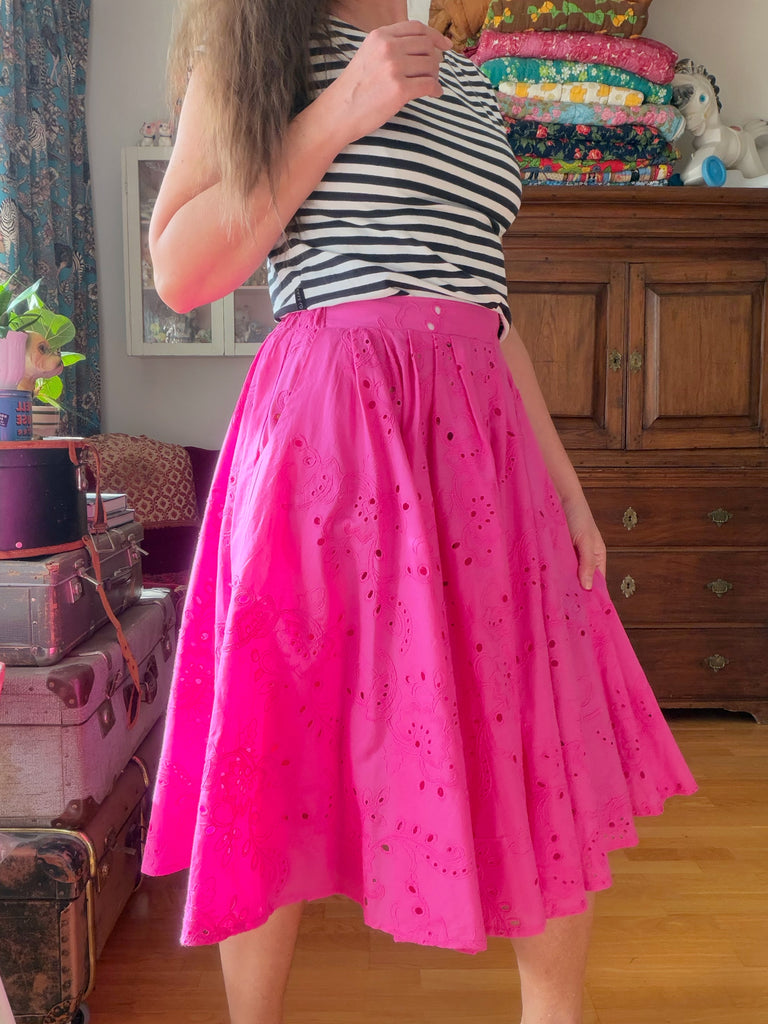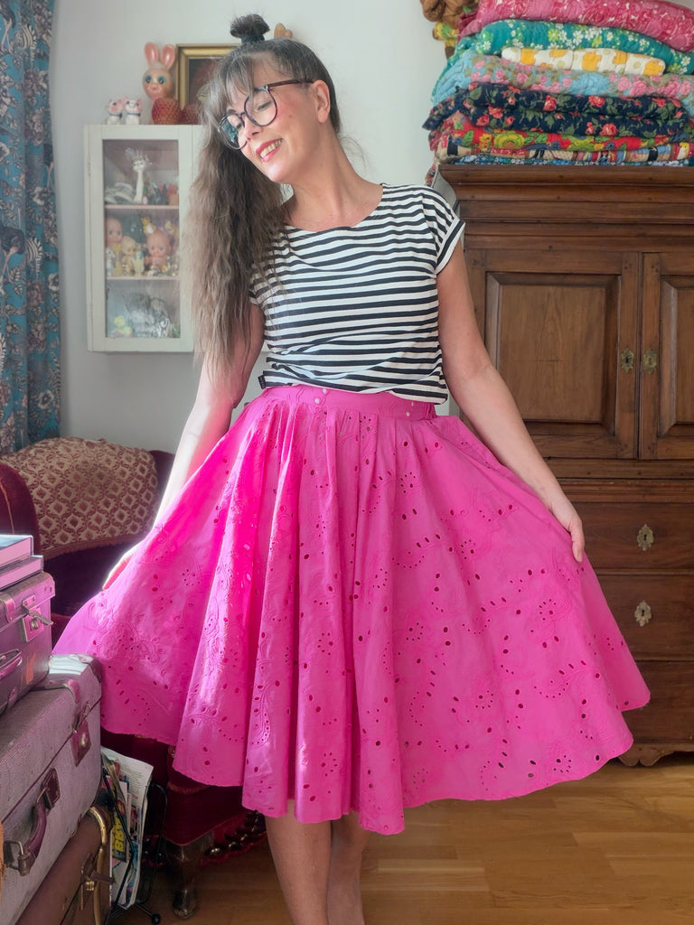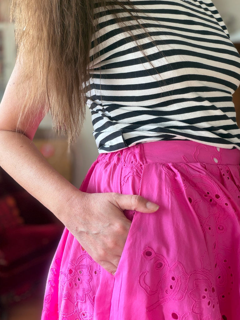 Ett glädjepiller till kjol i knalligste cerise. Broderier över hela tyget i samma färg. Krispig bomullspoplin.