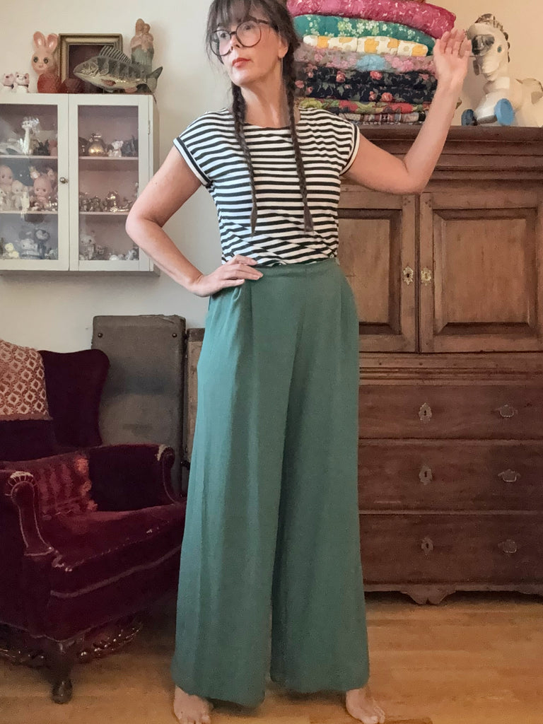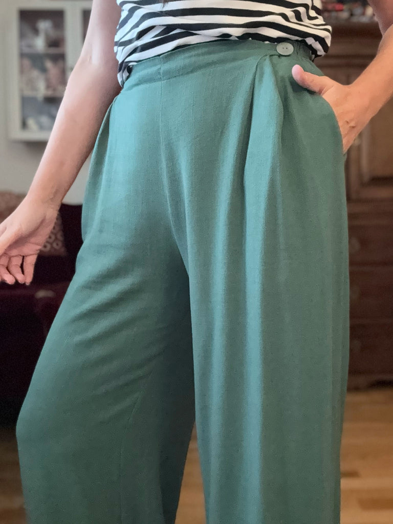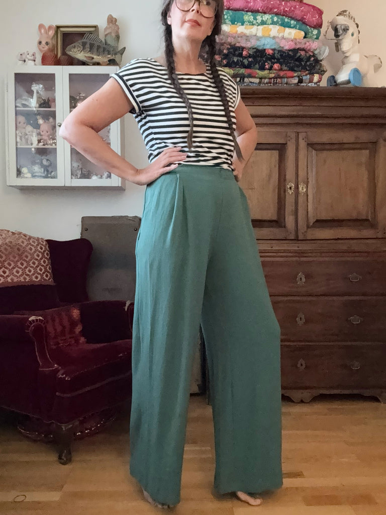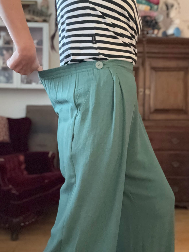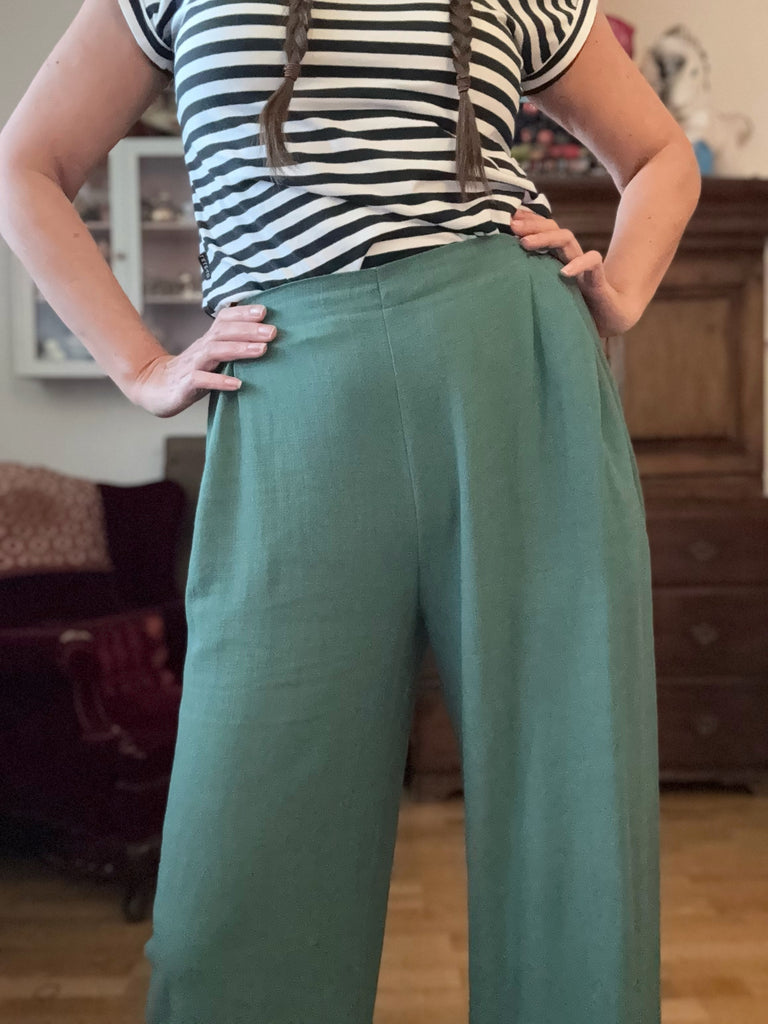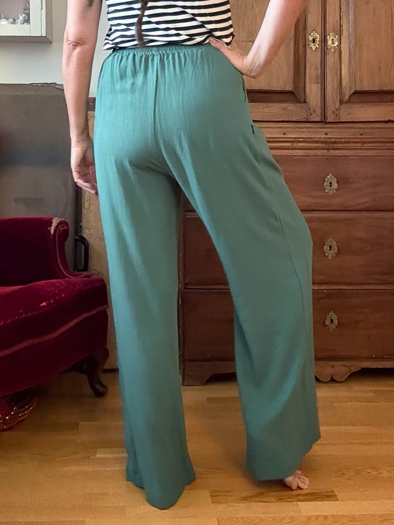 De här byxorna är i en härlig dimmgrön eller salviagrön färg som passar till mycket. Tyget är en blandning av linne och viskos vilket gör att byxorna får ett vackert fall men ändå har lite härlig struktur.